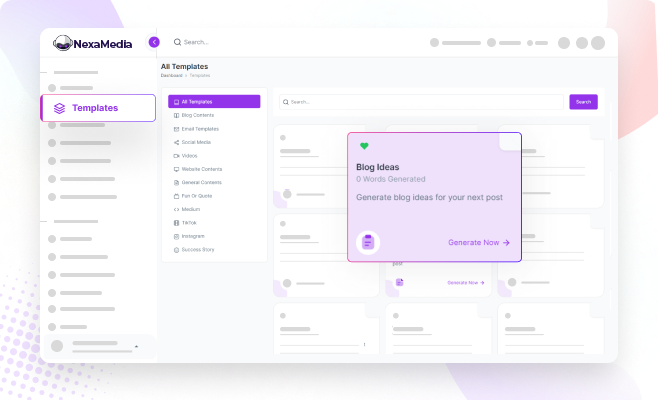 Augmentez la qualité de votre sortie en travaillant avec les invites prédéfinies de NexaMedia. Cela vous aide à guider notre logiciel vers un meilleur contenu et à choisir parmi les e-mails, les publications sur les réseaux sociaux, les articles de blog longs et plus encore !